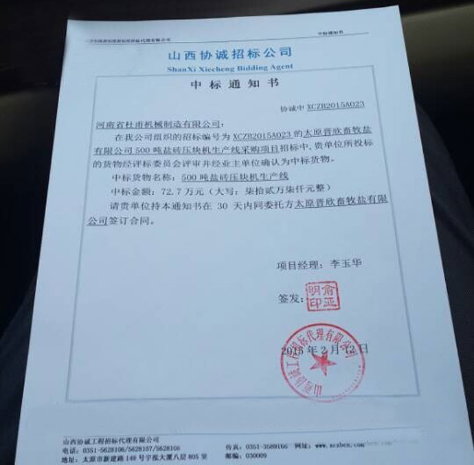 我公司順利中標山西協誠工程公司鹽磚壓塊機項目